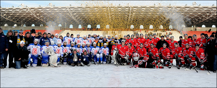 ![]() Но вернемся к противостоянию "Челмета" и "Лады" в "Русской классике". Свои планы в подготовке команд к матчу, и самому матчу внесла погода. Ввиду серьезных опасений из-за состояния льда на главном стадионе города "Центральном" были перенесены утренние фотосессии, раскатки команд и матч администрации. Все эти мероприятия проходили на катке университетского общежития, который только добавила "Русской классике" винтажности и атмосферности.