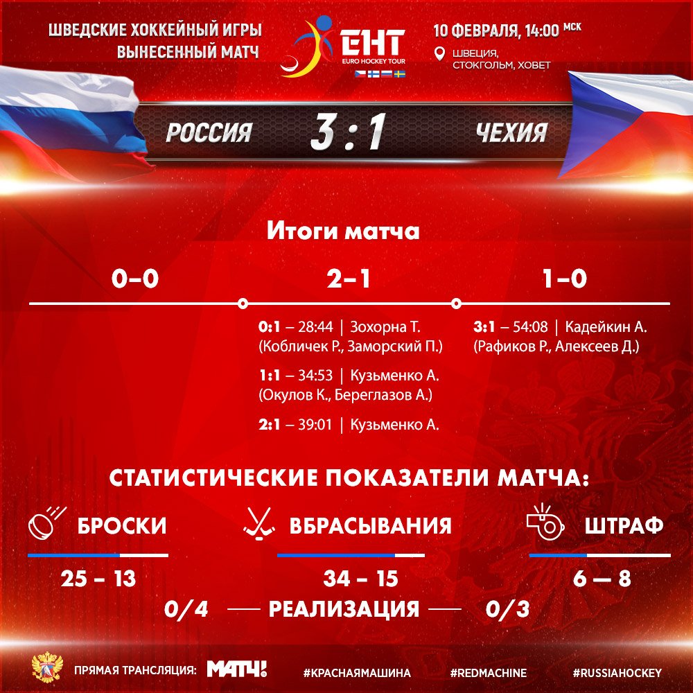 В третьем периоде россияне хорошо сыграли от соперника, хоть и, конечно, недостаточно мотивированного еще и играющего по предварительной договоренности без Коваржа и Серкача. Тем не менее, россияне грамотно распорядились ситуацией, а в третьей четверти двадцатиминутки решили все вопросы по итогам встречи: Кадейкин удачно подставил клюшку под дальний выстрел Рафикова, а Денис Алексеев напоследок набрал свое первое в карьере очко за сборную.