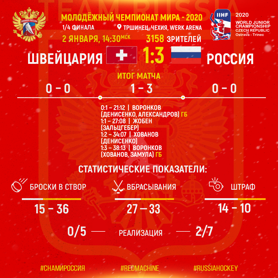 Сборная России в матче четвертьфинала Молодежного чемпионата мира обыграла сборную Швейцарии со счетом 3:1. Можно готовиться к полуфиналу. Так кто же сегодня заслужил отдельной похвалы?